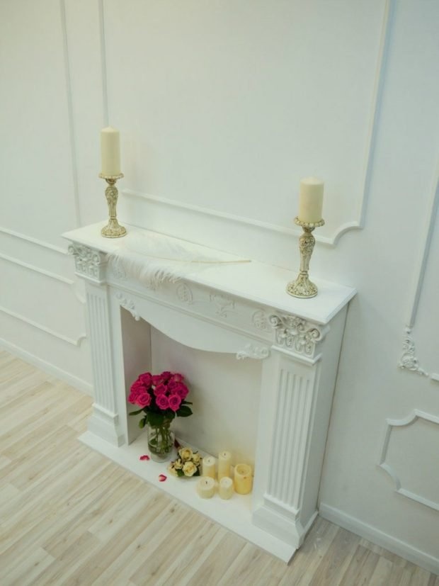 Поверхность из полистирола очень трудно шпаклевать. Чтобы облегчить этот процесс и обеспечить необходимый уровень адгезии, покройте всю поверхность малярной лентой. Если края получаются неровными и рваными, используйте уголок. Процесс нанесения шпатлевки аналогичен предыдущему варианту. После того как каминный пенопласт полностью высохнет, он готов к изготовлению декоративной облицовки. Если вам понравился этот вариант изготовления, обратите внимание, что конструкция из этого материала в дальнейшем не должна использоваться в качестве места для размещения горшков с комнатными растениями, различной техники и других тяжелых предметов. Только декоративные предметы.