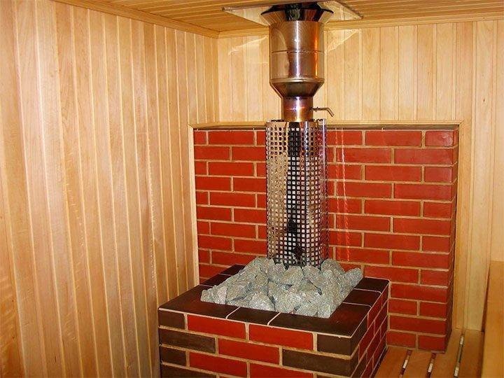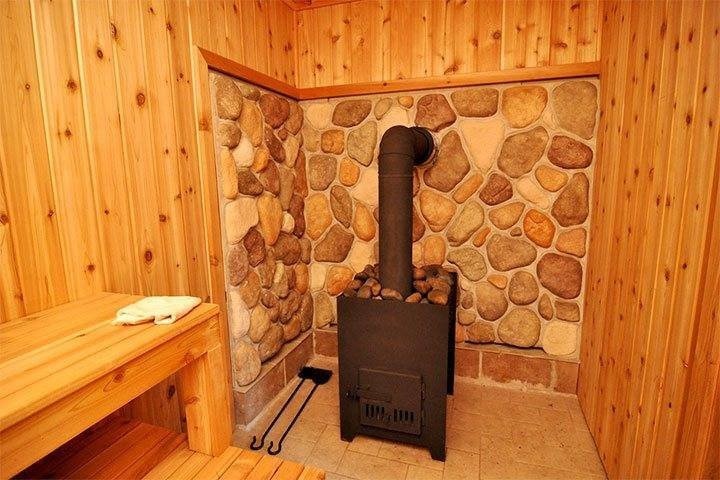 Камни укладываются сверху на плиту и не накрываются. Благодаря этому паровая баня нагревается быстрее, температура достигает 100 градусов. Но влажность в помещении низкая, поэтому тепло сухое.