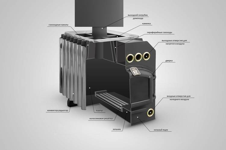 Конструкция большинства производителей состоит из высокого ящика с решетками и двойными жалюзи (выполняющими роль очага). Из горловины коробки выходит дымоход. Здесь камни также расположены в виде горла.