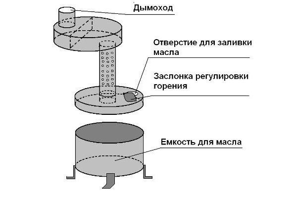 Масляные плиты имеют общий принцип работы. Небольшая камера заполняется отработанным маслом. Масло воспламеняется. Доводят до кипения. Пары нефти поднимаются по трубе. Они смешиваются с кислородом. Во второй камере происходит сжигание паров масла. Что касается материала, то верхняя камера печи и труба должны быть как можно более термостойкими. У них самые высокие температуры.