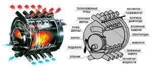 Конструкция газогенераторных плит отличается от традиционных моделей. Топливо медленно сгорает в первой камере сгорания. Пиролизный газ, образующийся в процессе горения, поступает во вторую камеру, где сгорает, а тепло используется для обогрева помещения.