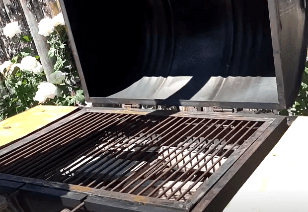 Гриль формируется путем вырезания откидной крышки. На высоте 10 см от дна устанавливается колосниковая решетка, на которую насыпается уголь. Это помогает: