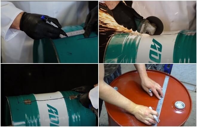 Схема барбекю из угольной бочки: разрезание крышки, установка решеток