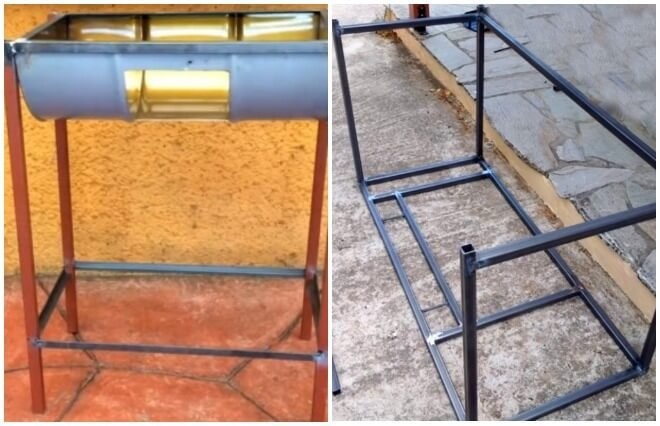 Для поддержки поперечины можно использовать профилированную трубу или арматуру. Опорные ножки изготовлены из стальной полосы, а кронштейны - из трубчатого материала.