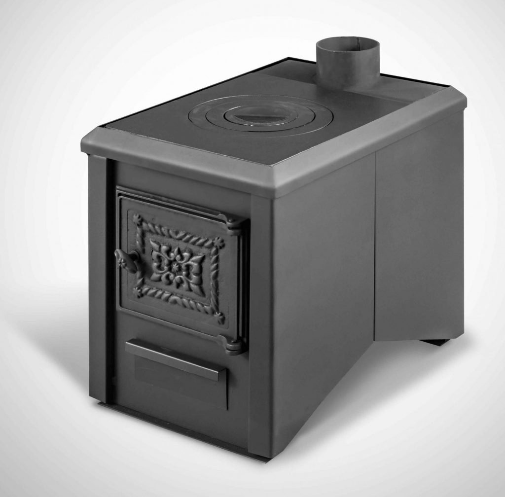 Первоначально это был металлический цилиндр или ящик, стоящий на железных ножках. У плиты была дверца и часть дымохода. Она была до невозможности простой и поэтому неэффективной. Если огонь гаснет, стенки плиты сразу же остывают.