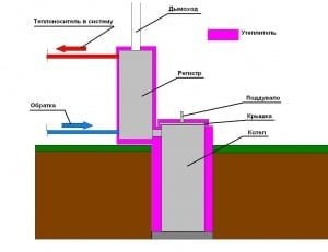 Вы можете обернуть котел и регистр базальтовой ватой, а сверху сделать листовое покрытие.