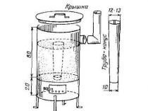 Как видно на рисунке, самодельная плита представляет собой контейнер с крышкой, разделенный на две части металлической перегородкой. В нижней части имеются приваренные ножки и дверь. В верхней части имеется кусок трубы, приваренный в качестве дымохода. Мы намеренно не указали размеры, поскольку все зависит от контейнеров и используемых материалов. Предположим, что вы используете 200-литровые бочки. Вам понадобятся: