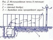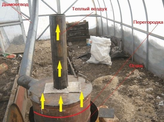 Несложный, экономически выгодный вариант - организовать отопление теплицы своими руками с помощью буржуйки. Конструкция печи элементарна: старая бочка с приваренной дверцей топки, дымоход, труба для выхода теплого воздуха и мостик в верхней трети бака. Принцип его работы показан на рисунке ниже. Нагрев происходит следующим образом:
