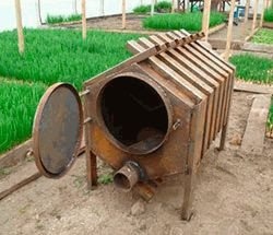 Хорошим решением для теплиц является глиняный горшок. Его особенность заключается в трубах большого диаметра, приваренных к корпусу и закрученных вокруг него. Воздух проходит по трубам благодаря естественным процессам, нагревается от нагретого тела и выбрасывается в окружающую среду. Поверхность нагрева и качество устройства намного выше. Сама плита представляет собой контейнер с дымоходом. Но по длительности горения котелок скорее проигрывает бубафону, так как работает по обычной схеме горения (не верхней).