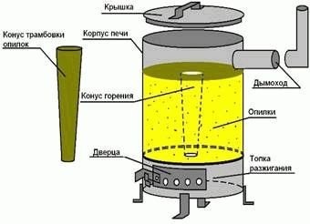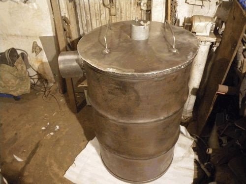 Если есть возможность использовать опилки для отопления, то для этого можно построить специальную машину. Поскольку топливо тлеет медленно, оно будет работать очень долго. Проще сделать его из двух одинаковых по размеру бочек. Одна из бочек разрезана поперек - это дно. Здесь формируется дверь для очистки.