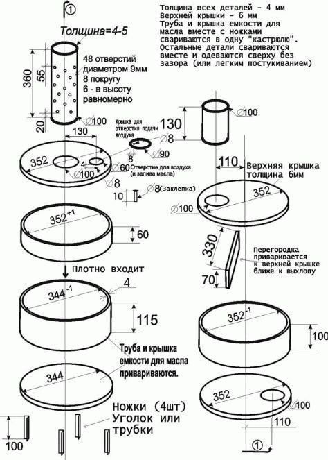 Поняв принцип работы и имея примеры схем и чертежей, можно приступать к строительству. Вам необходимо определить мощность. Вы можете использовать бочку, большую трубу, использованный газовый баллон или лист, приваренный к колесу. В каждом случае необходимо завершить обработку выбранного объекта. Алгоритм следующий: