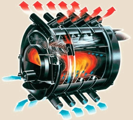 Благодаря процессу естественной конвекции холодный воздух всасывается через нижние отверстия в трубах. Проходящий через них газ нагревается корпусом плиты, к которому примыкают трубы, и выходит уже горячим (50-60 градусов) через верхние отверстия. Тепличная печь работает на дровах, угле, пеллетах, отходах пиломатериалов.