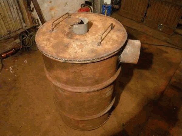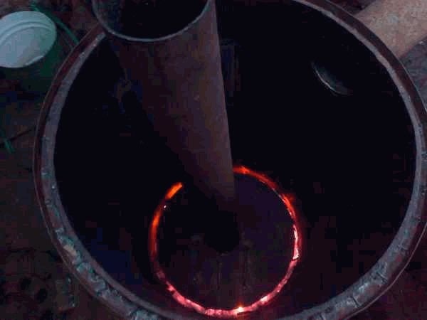 В результате древесина будет постепенно тлеть, крышка будет давить на нее, и она будет постепенно опускаться. Кстати, по уровню опускания можно определить, когда нужно долить топливо.