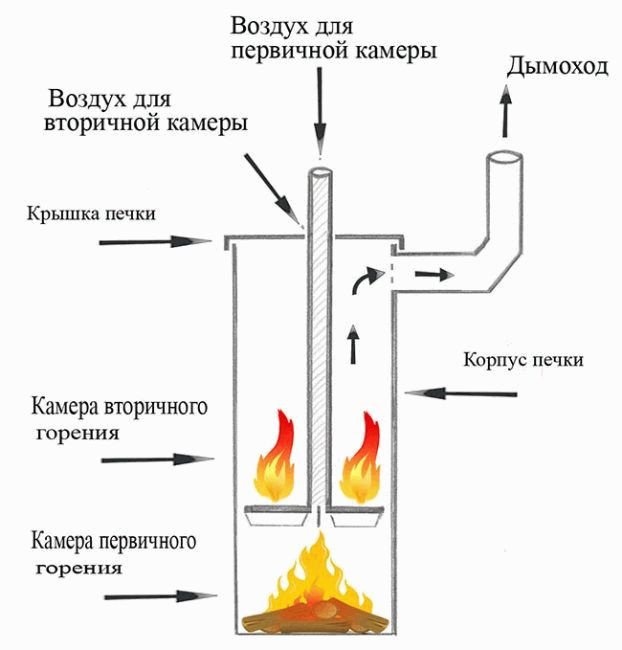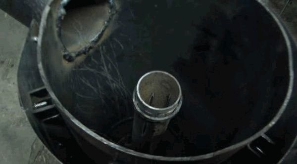 Чтобы сделать печь самостоятельно, необходимо понимать ее конструкцию и процессы горения в ней. Воздух подается через трубу в верхней части нагревателя. Именно топливо, находящееся в верхней части, начинает гореть. При горении образующаяся зола будет попадать на древесину и мешать ее сгоранию. Поэтому необходимо обеспечить установку какого-либо пресса. Это может быть металлический блин, диаметр которого на несколько сантиметров меньше контейнера. В центре вырезается отверстие, в которое вставляется кислородная трубка.