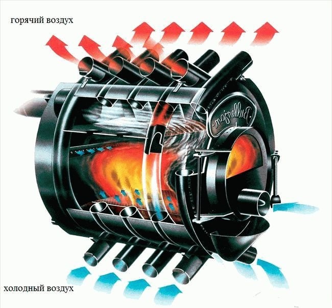 Передача тепла происходит так же, как и в плите с длинным очагом: за счет излучения стенок и нагрева воздуха, втягиваемого естественной конвекцией через верхнюю часть корпуса. Рисунок хорошо иллюстрирует этот процесс. В некоторых случаях дополнительно устанавливается вентилятор для отвода горячего воздуха под давлением. Это ускоряет нагрев пространства теплицы.