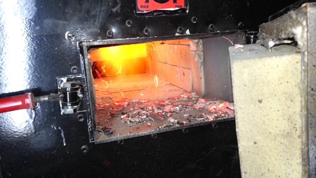 Несмотря на это, древесина сгорает эффективно и полностью, практически без мелкой золы, так как сухая древесина или древесные продукты сгорают до мелкой золы, которая легко выдувается вентилятором через сопло в дымоход.