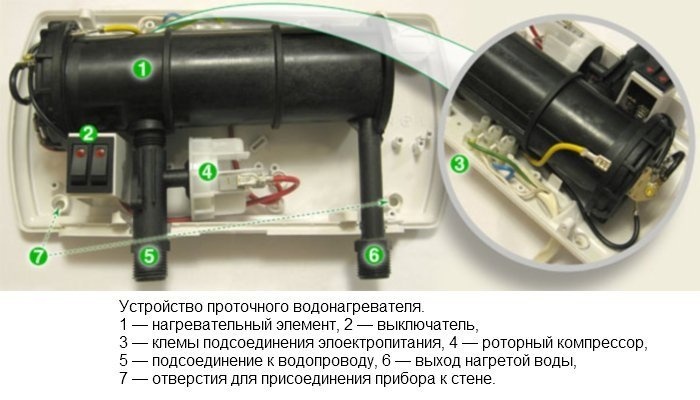 Каждый водонагреватель мгновенного действия состоит из собственно нагревательного элемента (запаянного со всех сторон цилиндра, от которого отходят два отрезка трубы с ? " (дюйм) и три клеммы для подключения несущего, нейтрального и заземляющего проводника соответственно), выключатель или переключатель включения/выключения и корпус.