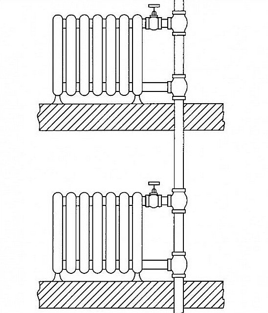 А. Самый простой вариант "Ленинградки" - радиаторы просто устанавливаются последовательно на трубе, без каких-либо запорных и регулирующих устройств, с протекающим теплоносителем.