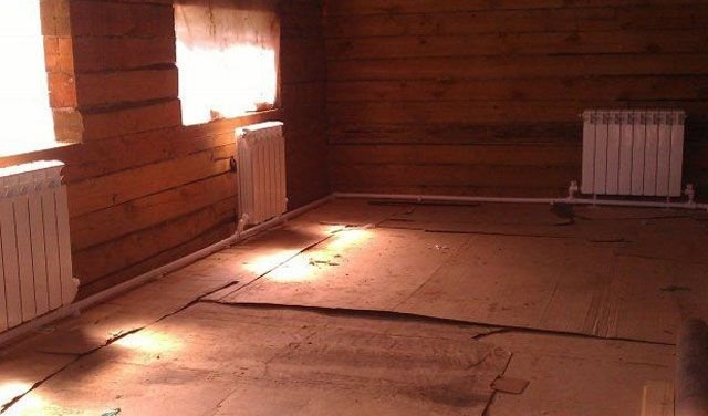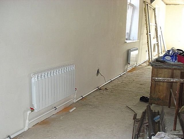 Нижняя магистральная труба закрыта финишным покрытием пола. Подводящие трубы уже встроены в стену