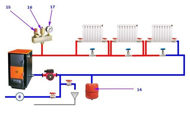 В случае закрытой системы отопления необходимо установить "группу безопасности". Он устанавливается в самой высокой точке контура и обычно содержит три обязательных элемента. Это: предохранительный клапан, рассчитанный на определенный верхний предел давления (поз. 15), автоматический воздухоотводчик (поз. 16) и манометр (поз. 17) - для визуального контроля.