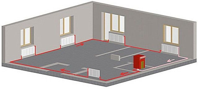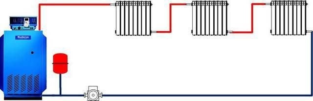 Такой тип расположения радиаторов чаще всего используется в одноэтажных зданиях - когда все радиаторы находятся на одном уровне. Основная труба, по которой циркулирует циркуляция от котла, всегда располагается вдоль пола. Кстати, это позволяет без проблем разместить его под напольным покрытием.