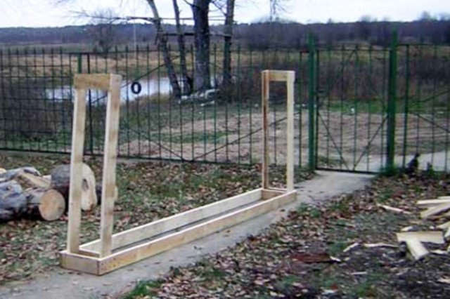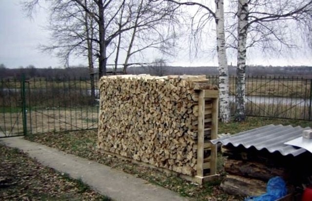 Если штабель во дворе должен быть отдельно стоящим, то для защиты дров от рассыпания используется полурама из деревянных брусьев.