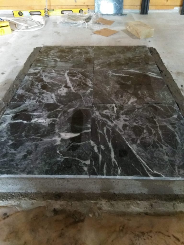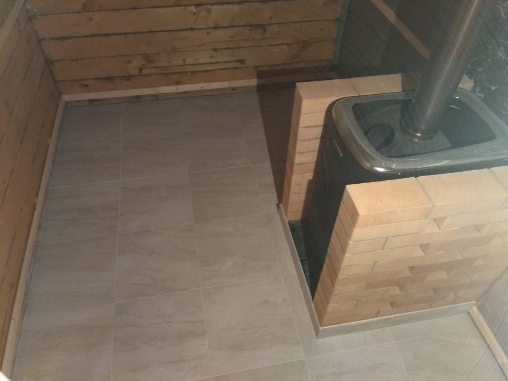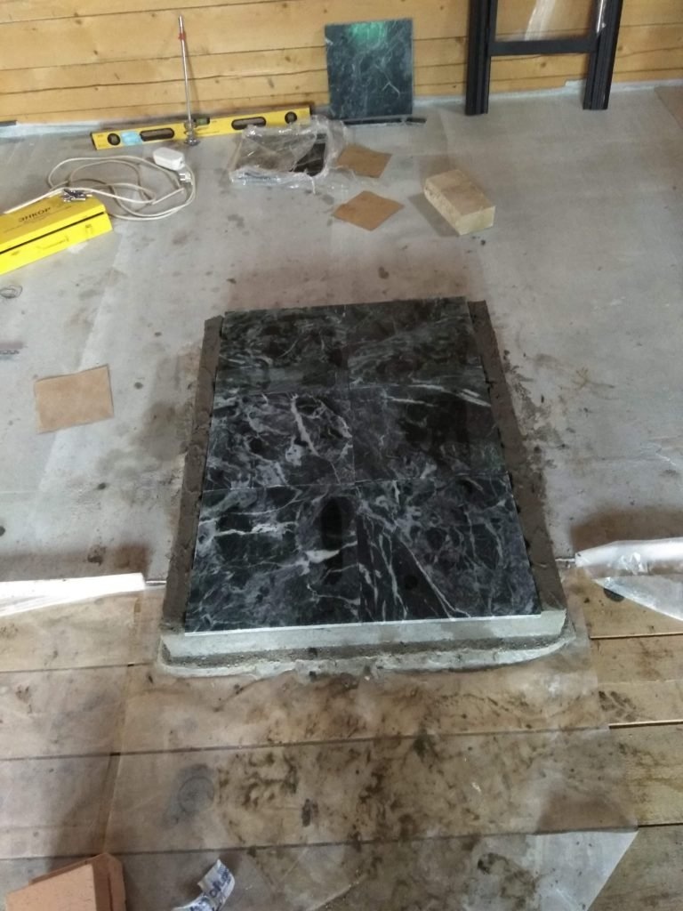 Чтобы подиум выглядел красиво, мы положили на него плитку из натурального камня (серпентинита). Плитка имеет размер 30х30 см, поэтому мы рассчитали длину подиума над ним в 90 см. Мы приклеиваем плитки термостойким клеем. Подождите 24 часа, чтобы клей высох, прежде чем укладывать кирпичи вокруг каменки.