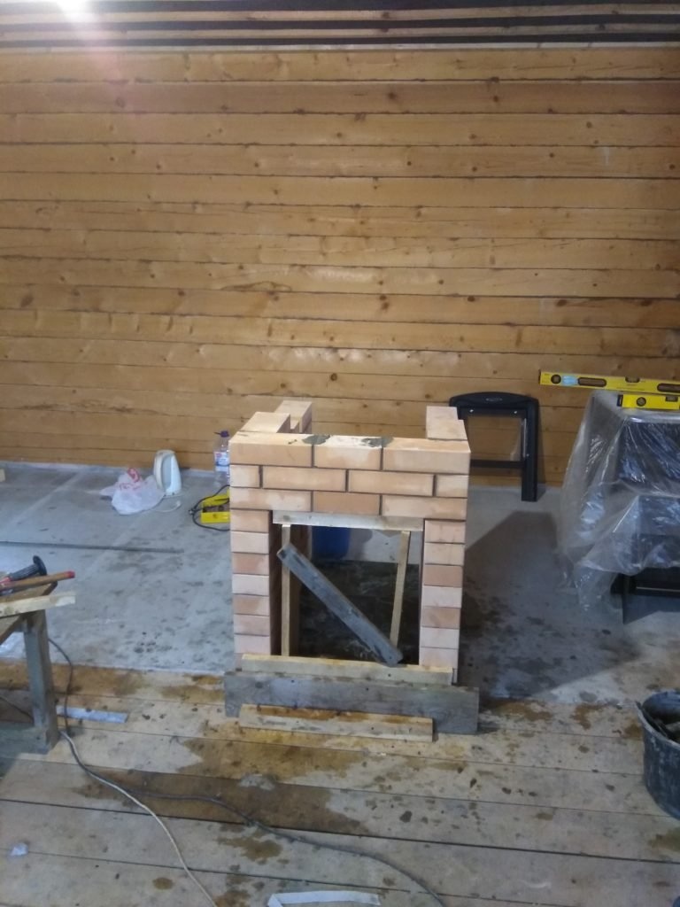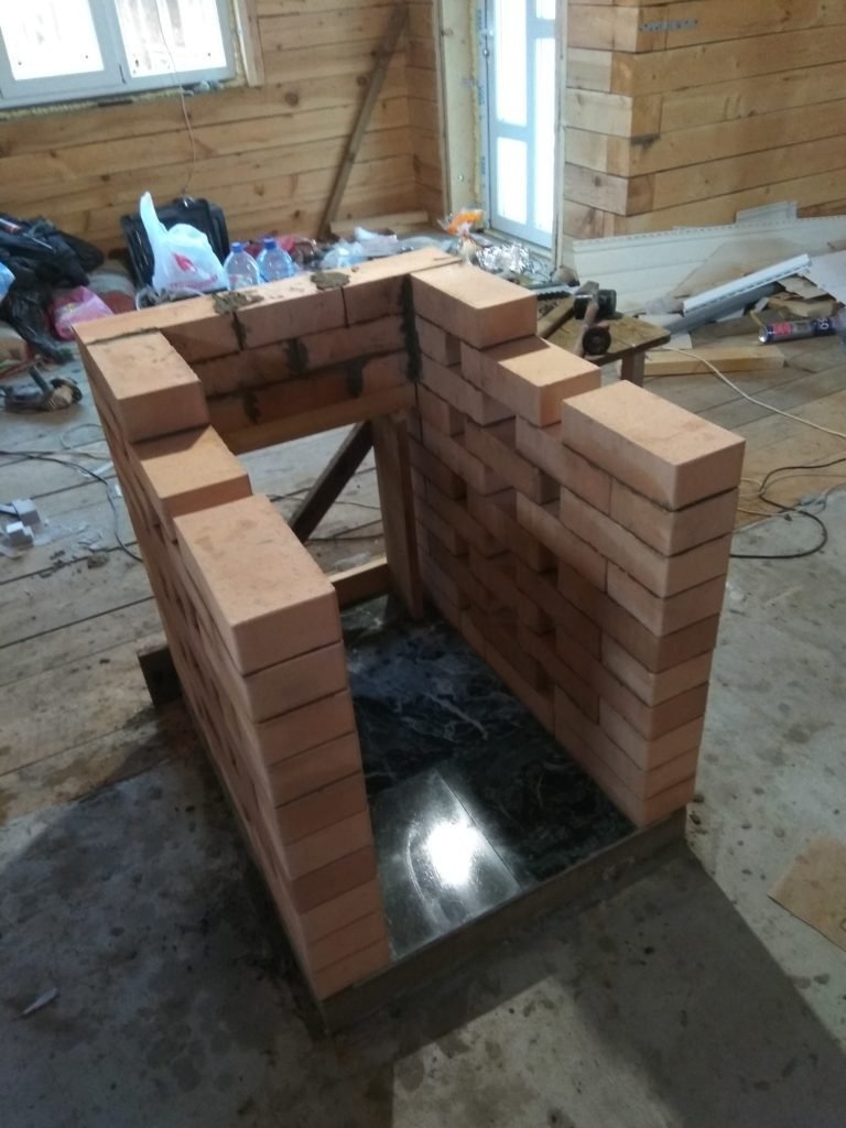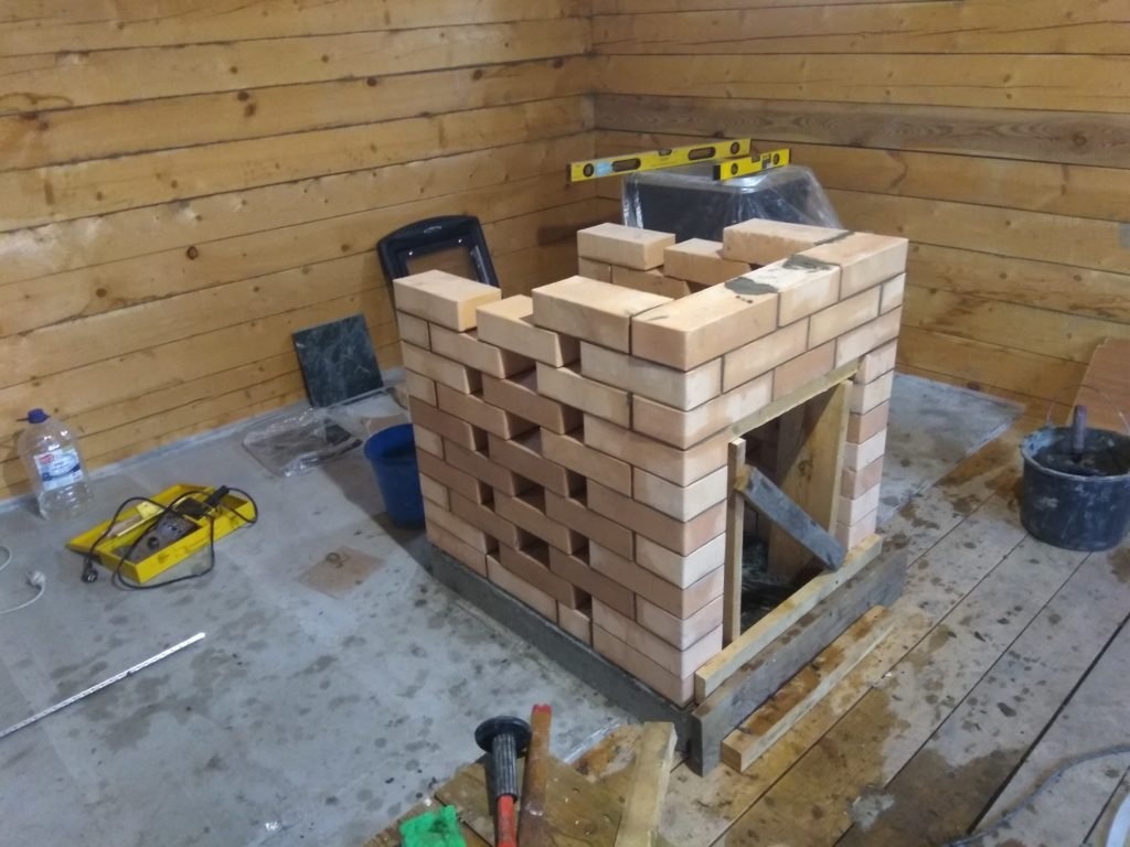 Прежде чем начать укладывать кирпичи на клей, я уложил их так, как они должны быть уложены. С помощью шлифовальной машины я отпилил кирпичи до нужного размера. Важно контролировать вертикальное и горизонтальное выравнивание с помощью спиртового уровня. Уплотните кирпичи термостойким клеем, предназначенным для кладки плит. Оставьте небольшой зазор между кирпичами, чтобы придать оригинальность стенам вокруг плиты. Продолжайте укладывать кирпичи до верха дверцы печи, затем сделайте опору, чтобы построить арку над дверцей. Мне потребовалось одиннадцать рядов до верха плиты, около 75-80 кирпичей и целый день времени. Сделать кирпичи самостоятельно не так уж сложно, а даже легко и весело. На мой взгляд, получилось очень хорошо!!!