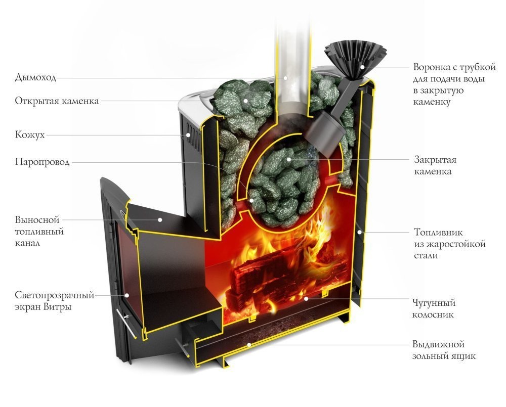 Курение происходит за стеклянной дверью, поэтому вы можете наблюдать за пламенем и вовремя подбрасывать дрова. Нагрев происходит быстро, и корпус не слишком горячий. Большим недостатком этой каменки является маленький зольный ящик.