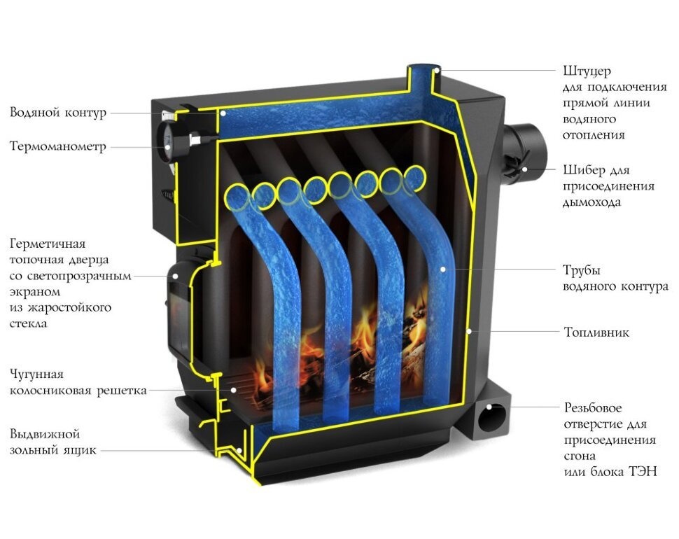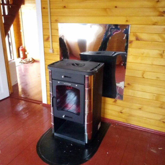 Корпус защищен огнеупорными пластинами, поэтому он совершенно не нагревается. Помимо обогрева основных помещений, возможно подключение каналов для разветвленного отопления.