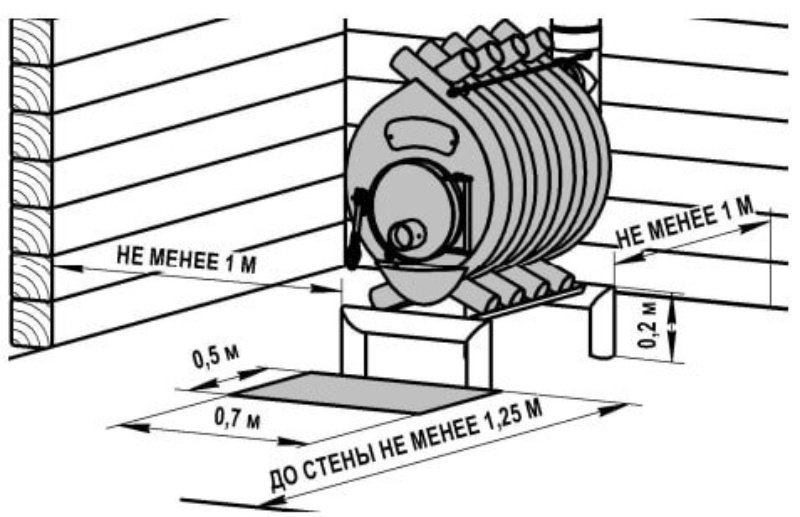 В качестве основания можно использовать стальную пластину высотой не менее 1,5 мм. Она должна опираться на асбест. Оптимальный радиус составляет примерно 1,2 м до двери. Подушка должна выходить за край горшка на 25-30 см. Обратная сторона плиты должна располагаться на расстоянии 1-1,5 м от стены. Если предварительно покрыть его огнеупорной штукатуркой, то расстояние можно сократить до 0,8 м.